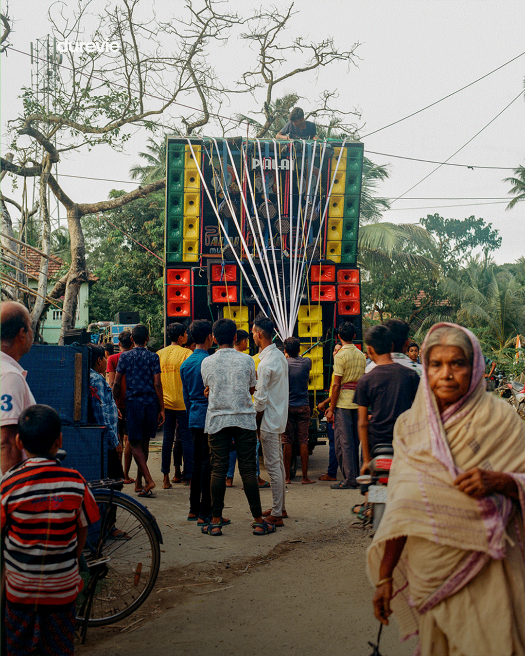 Enceintes artisanales empilées les unes sur les autres, montées sur des véhicules de fortune. Basses assourdissantes, tantôt accompagnées de drums métalliques, de sirènes ou de samples agressifs, tantôt laissées vrombir dans toute leur majesté. On se croirait dans les rues de Kingston, de Londres ou de Rio, mais les tenues traditionnelles et les samples bollywood ne trompent pas : c’est bien au cœur de la campagne au Bengale Occidental, en Inde, que résonnent ces sound systems.
